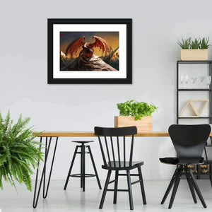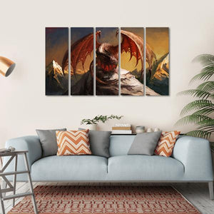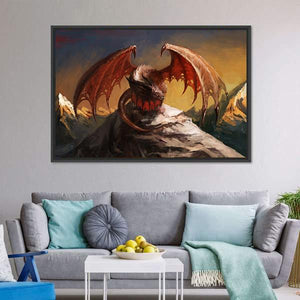 This striking canvas art features a powerful dragon with large red wings looming over majestic snow-capped mountains. The dramatic sky and rich palette of red, orange, and grey evoke a mythical atmosphere, making it a captivating addition to any fantasy lover's decor.