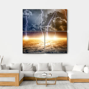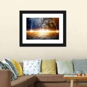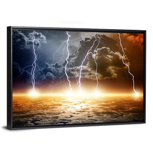 Capture the raw power of nature with this striking artwork showcasing powerful lightning strikes against dark storm clouds. The interplay of blue, orange, and gray creates an intense atmosphere that brings a dramatic touch to your wall décor.
