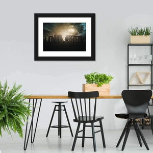Experience the ancient and dramatic essence of Stonehenge captured in this panoramic canvas wall art. The artwork features grey and brown stone monoliths underneath an overcast sky, with hints of yellow from the setting sun. Ideal for adding an atmospheric touch to your home decor.