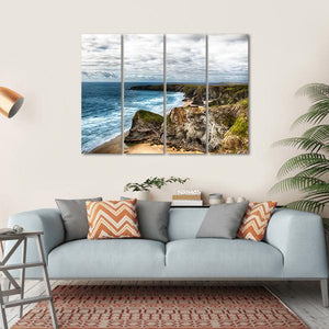 This canvas art captures the rugged beauty of coastal cliffs and a crashing ocean, evoking a dramatic yet natural atmosphere. Shades of blue, green, and brown come together to portray a scene of waves hitting the rocky shoreline under an overcast sky.