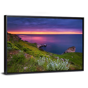 This canvas features a stunning seascape with coastal cliffs, an expansive ocean, and a vibrant sunset sky. The rich palette of purple, pink, blue, and green creates a serene yet dramatic atmosphere, making it an ideal addition to your wall decor.