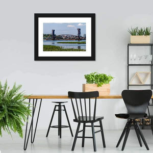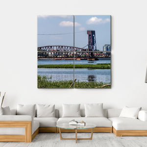 This captivating canvas art features a serene view of a vertical lift bridge over calm waters, complemented by lush green vegetation. Its industrial vibe, combined with a palette of browns, blues, and whites, makes it an ideal piece for enhancing any contemporary space.
