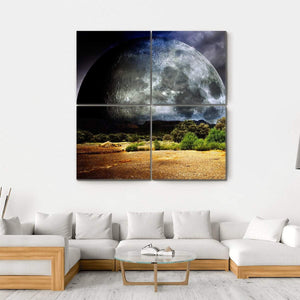 This canvas artwork features a large moon dominating a surreal night sky, set against stormy clouds and a desert-like landscape. The dramatic palette of blue, gray, brown, and green adds depth and intrigue, making it a striking addition to your wall decor.