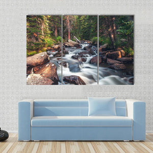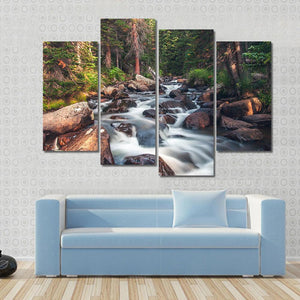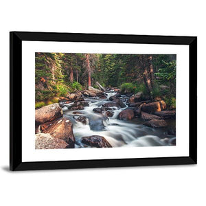 This landscape artwork beautifully captures a river flowing through a forest. With a serene palette of greens, browns, and whites, it invites a natural atmosphere into your space.