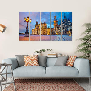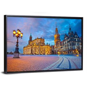 This canvas features a serene cityscape of Dresden, showcasing historic buildings against a softly lit dusk sky. The atmospheric scene captures a charming town square, complete with a glowing street lamp and cobblestone paths, creating an inviting ambiance for your space.