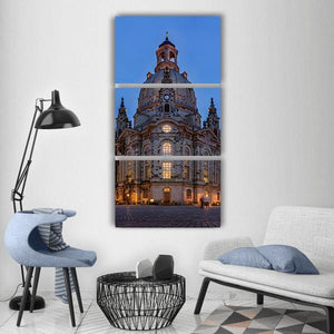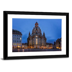 This photorealistic canvas shows the Frauenkirche in Dresden, centered at eye level with its glowing facade and illuminated windows. The scene reads majestic, historic, and quietly serene, with a palette of blue, beige, gold, and grey. It suits living rooms, hallways, or any space with modern or city-inspired decor.
