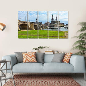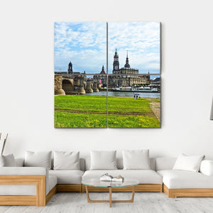 This cityscape features Dresden's stunning architecture, including a majestic stone bridge with arches and towering cathedrals set against a backdrop of soft clouds. The historic and grand atmosphere combined with a palette of green, blue, and grey enhances any space with a scenic touch.