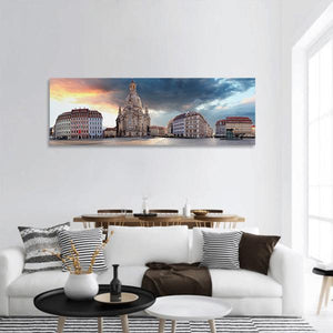 Depicts Dresden cityscape at sunrise, featuring the Fraumünster church beneath dramatic, stormy clouds. Realistic panorama uses blues, oranges, greys, and whites for a majestic, dramatic mood that suits modern living rooms and office walls.