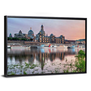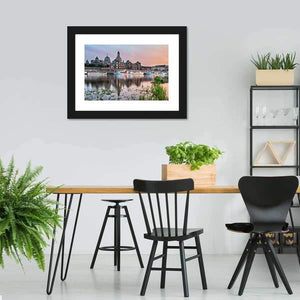 Elbe River in Dresden is shown here in a panoramic, realistic cityscape with domed buildings and boats reflected across calm water. Soft blues, pinks and golds give the scene a serene, picturesque sunset feel. It suits modern living rooms and offices as a calming room decor piece.