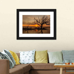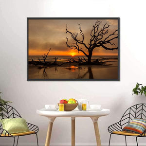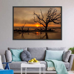 This landscape canvas captures a silhouetted dead tree on a quiet beach at sunrise, with driftwood and the sunset reflected on wet sand. Warm orange, brown and gray tones and a rule-of-thirds composition give a serene, slightly dramatic, natural mood, suited to coastal or rustic, nature-inspired room decor.