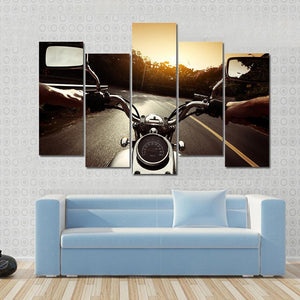 Experience the thrill of the open road with this captivating canvas that captures a first-person view of a motorcycle gliding along a sunset-lit highway. The warm palette of oranges, yellows, and browns sets an adventurous tone, making it a striking addition to any wall.