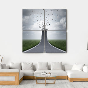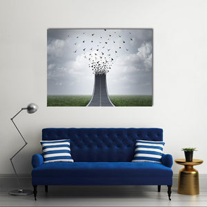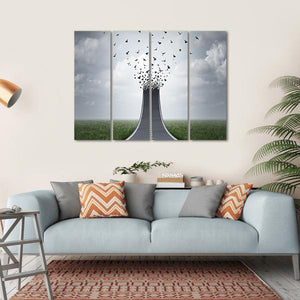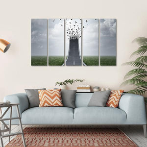 This modern abstract canvas captures a surreal scene of a flock of birds dispersing from the end of a road. The gray and green palette evokes a sense of hope and transformation, making it an inspiring addition to any space.