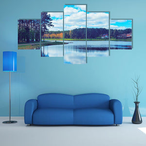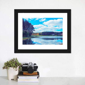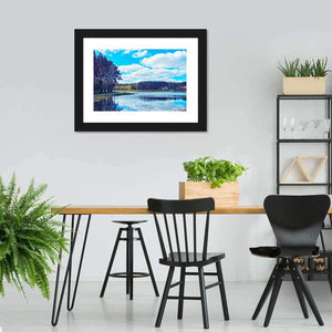 Druskonis Lake in Druskininkai shows a calm lakeside scene with trees, clouds and a distant house reflected in still water. Realistic blues, greens and soft browns create a peaceful, serene mood that fits modern or nature-inspired rooms.