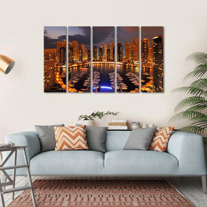 This captivating canvas art captures the Dubai Marina skyline at dusk, featuring illuminated skyscrapers and serene yachts docked at the harbor. Its vibrant palette of orange and blue conveys a lively urban atmosphere, making it a striking addition to your wall decor.