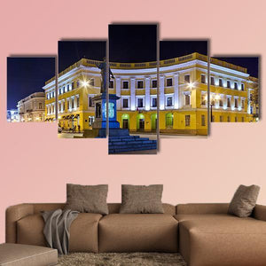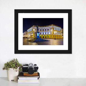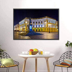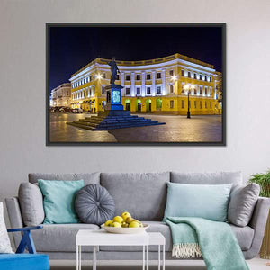 Duke Of Richelieu Monument Canvas shows a nighttime city square with an ornate, many-windowed building, a large stone statue on its pedestal, and streetlights. The rule-of-thirds composition and a yellow, blue, black and white palette give the scene an illuminated, historic mood. Suits classic or modern living spaces as wall decor.