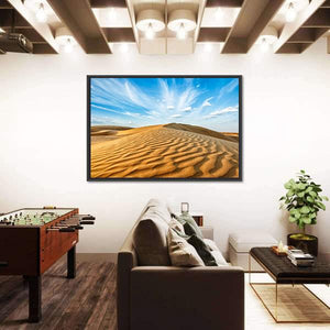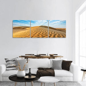 This panoramic canvas captures the Thar Desert’s rippled sand dunes beneath a wide blue sky dotted with wispy clouds. The photographic, naturalistic image feels serene and vast, and it suits modern or nature-inspired rooms.