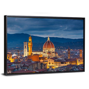 Florence Cathedral’s dome is centered over the city skyline in a photorealistic canvas, shown illuminated at dusk. A blue, orange, brown and grey palette gives a majestic, serene, historic atmosphere that works well with modern or European-inspired room decor.