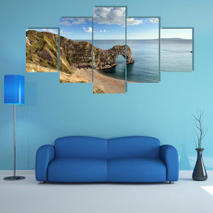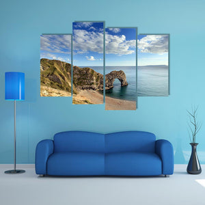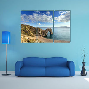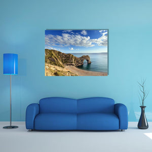 This canvas art features the majestic Durdle Door, a natural sea arch surrounded by coastal cliffs and a serene beach. The realistic depiction captures the light blue sky dotted with white clouds, making it a picturesque addition to your space.