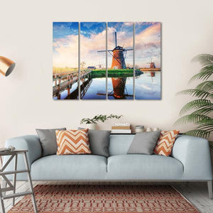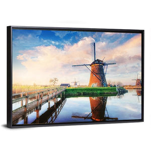 This canvas art features picturesque Dutch windmills surrounded by tranquil water and a wooden bridge. With its serene blue and orange palette, it brings a peaceful ambiance to any space.