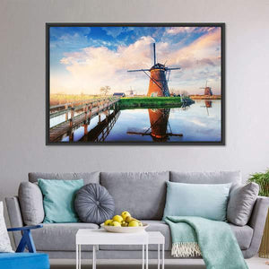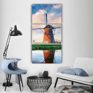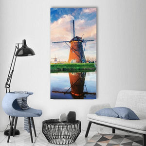 Capture the serene beauty of Dutch windmills with this vertical canvas wall art. The peaceful landscape features a stunning reflection in calm water, surrounded by vibrant orange, blue, and green hues that evoke an idyllic atmosphere.