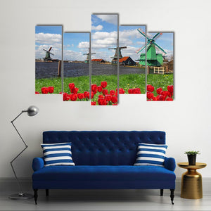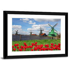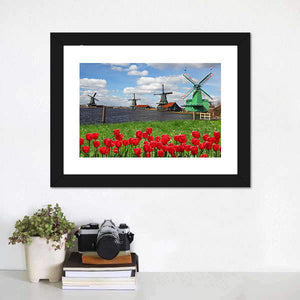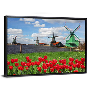 This canvas art captures traditional Dutch windmills set against a picturesque field of vibrant red tulips. The serene scene combines elements of water and sky, creating a bright atmosphere perfect for enhancing any space.