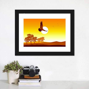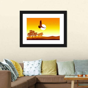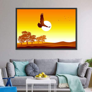 An eagle soars above a stylized savanna at sunrise, shown in bold silhouette against a centered sun with radiating lines. The minimalist, layered landscape uses warm oranges, yellows, browns and deep blacks to create a serene yet dramatic mood. It suits modern or minimalist room decor that favors nature-inspired art.