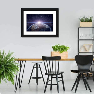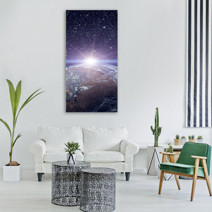 This captivating canvas features a stunning view of Earth from space, showcasing visible continents and a starry sky. The awe-inspiring colors of blue, purple, and white create a vast and peaceful atmosphere, perfect for elevating any room decor.