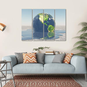 This modern abstract piece captures a concerning view of a melting planet Earth, highlighting North and South America. With a palette of blue, green, and gray, it evokes a serious mood, making it a striking addition to your wall decor.