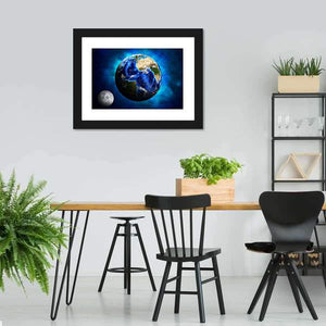 This artwork showcases a stunning view of Earth with visible continents and oceans, complemented by the moon in the foreground. The deep cosmic perspective and starry nebula background create an awe-inspiring atmosphere, perfect for adding a touch of wonder to your space.