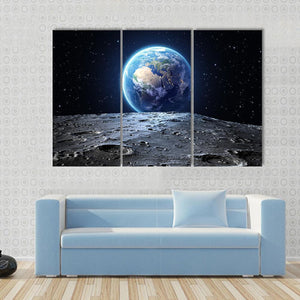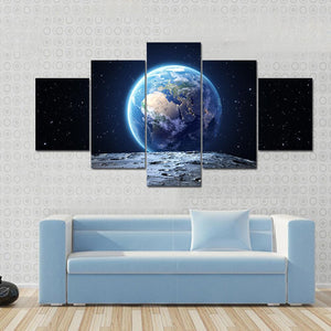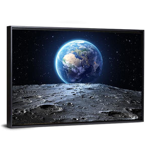 Experience the vastness of space with this stunning view of Earth from the moon's surface. The photorealistic artwork showcases craters and city lights, creating a serene atmosphere perfect for any room.