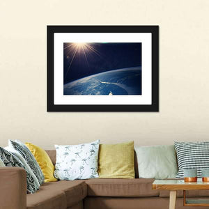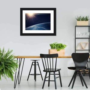 This striking canvas captures the earth from space, showcasing a stunning sunburst and cloud formations. The beautiful blend of blue, white, and yellow creates an awe-inspiring, serene atmosphere that complements modern wall decor.