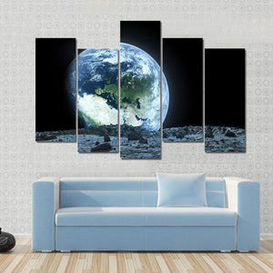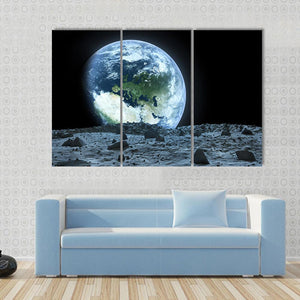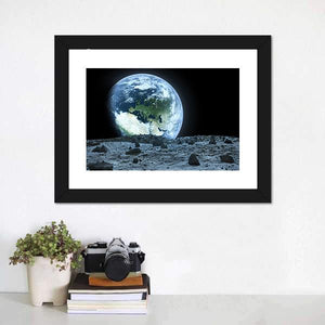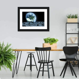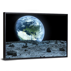 This stunning artwork captures Earth from the moon's surface, presenting a breathtaking view of our planet against a cosmic backdrop. Its vast and serene feel adds a sense of wonder to any space.