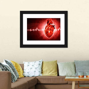 An anatomical heart rendered in 3D sits at the center of this canvas, set against a red grid and crossed by a white electrocardiogram (ECG) waveform. The modern, abstract composition in red, black, and white creates a dramatic, medical mood that fits modern homes and medical spaces.