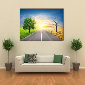This canvas features a powerful landscape depicting a road dividing lush greenery and arid desert. The contrasting imagery of a live tree next to a dead one reflects the journey and transition of nature, evoking contemplation about our environment.
