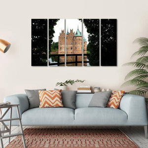 Capture the picturesque beauty of Egeskov Castle in Denmark with this stunning canvas wall art. The tranquil scene features a brick castle with green roofs, surrounded by a moat and lush trees, reflecting a sense of history and depth.