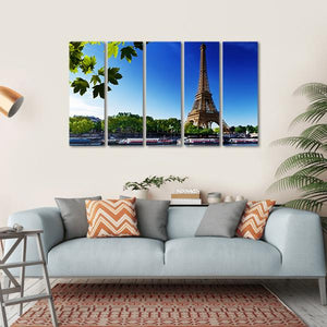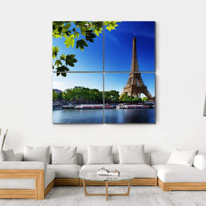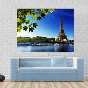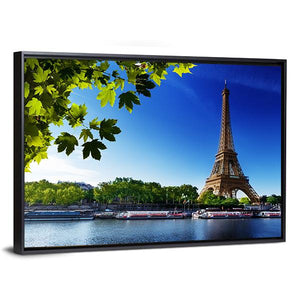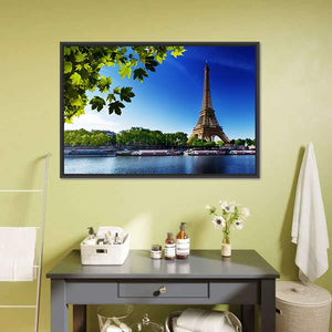 This canvas art captures the Eiffel Tower at sunrise, framed by vibrant leaves and a peaceful Seine River scene. With its bright palette of blue, green, and white, it brings a touch of scenic beauty to any space.