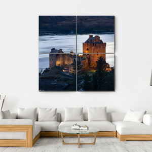 This captivating canvas features Eilean Donan Castle, beautifully reflecting on a serene lake at dusk. The warm lights illuminating the historic castle against a backdrop of dark trees and gentle hills evoke a sense of tranquility, making it a perfect addition to any space seeking a touch of calm and elegance.