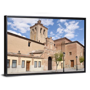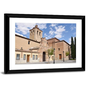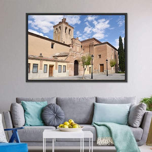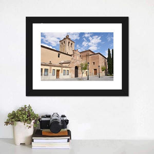 A realistic, sunlit view of a stone church façade in Spain, with a bell tower, arched windows, brown tiled roof and cobblestone street. The warm tan-and-brown palette and serene, historical mood make it a calm choice for home wall decor.