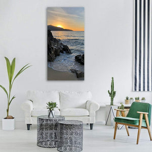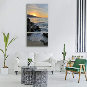 Golden Sunset Over Rocky Coastline Vertical Canvas Wall Art