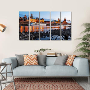 This vibrant canvas features a serene riverfront cityscape showcasing Germany's historic architecture. The illuminated buildings and reflections in the water create a captivating atmosphere that brings life to any space.