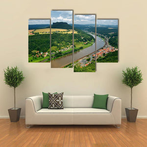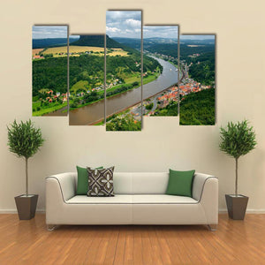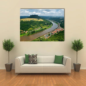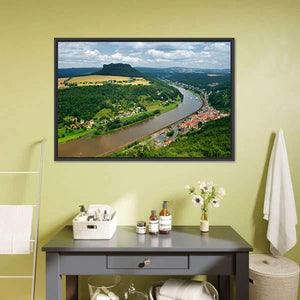 This canvas captures the Elbe River in Germany with a high-angle view of a winding river, town rooftops, boats, wooded hills and patchwork fields. The scene reads as scenic, peaceful and expansive, rendered in natural greens, blues and earth tones. It suits modern or nature‑inspired rooms looking for a calm landscape focal point.
