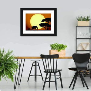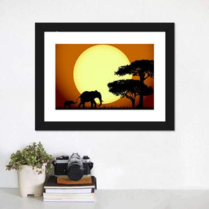This canvas features a serene silhouette of a mother and baby elephant against a peaceful sunset. The warm palette of orange and yellow evokes a natural feel, making it a lovely fit for various spaces.