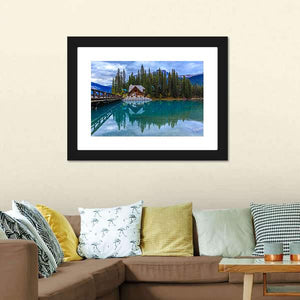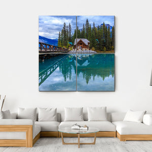 Experience the serene beauty of Emerald Lake in this stunning canvas print. Featuring a tranquil scene with a wooden cabin and pier nestled among pine trees and mountains, this artwork captures the clear turquoise lake and its reflective charm.