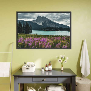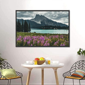A panoramic nature photograph of an emerald lake with snow-capped mountains and a field of purple flowers in the foreground. The blues, greens and soft purples create a serene, peaceful atmosphere that suits modern living spaces.