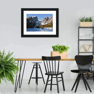 This canvas art features a serene winter scene with snow-covered mountains and a frozen lake, surrounded by dense pine trees. It captures the majestic beauty of nature, perfect for bringing a fresh, tranquil atmosphere to your space.