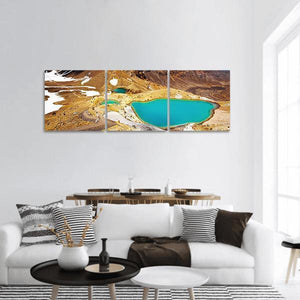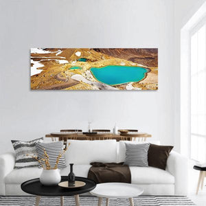 This panoramic canvas captures Tongariro National Park in an aerial view, with vibrant turquoise lakes set against barren, snow-dusted terrain. The blue, brown, white and gold palette creates a serene, expansive, natural mood that works well in modern or nature-inspired rooms.