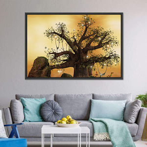 A centered fantasy tree with glowing orbs, mossy rocks and foliage creates an enchanting, whimsical scene. Rendered in browns, greens, yellows and white, this canvas fits modern home decor and room accents.