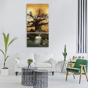 A fantasy tree and swan beside a softly lit pond dotted with lotus flowers create a magical evening scene. Glowing lanterns in the branches and the swan’s reflection in the water bring warm golden, green, white, and brown tones that suit modern or nature-inspired rooms.