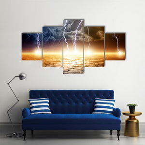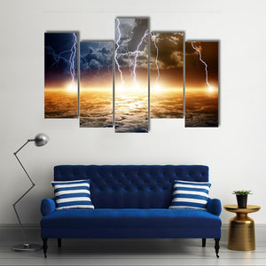 This striking canvas features multiple lightning strikes amidst dark storm clouds, set against a vivid blue and orange sky. Its powerful and intense scene creates an awe-inspiring atmosphere, making it a captivating addition to modern décor.