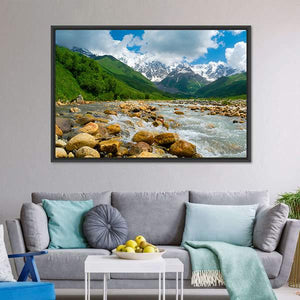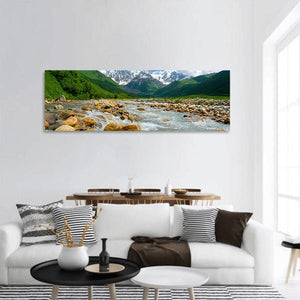 A panoramic view of the Enguri River in Georgia, showing a clear, rocky riverbed flowing beneath snow-capped mountains and green hills. The realistic scene feels serene and majestic, with lush vegetation and a cool palette of greens, blues, grays, and browns. Suits modern or nature-inspired rooms as a calm focal piece.
